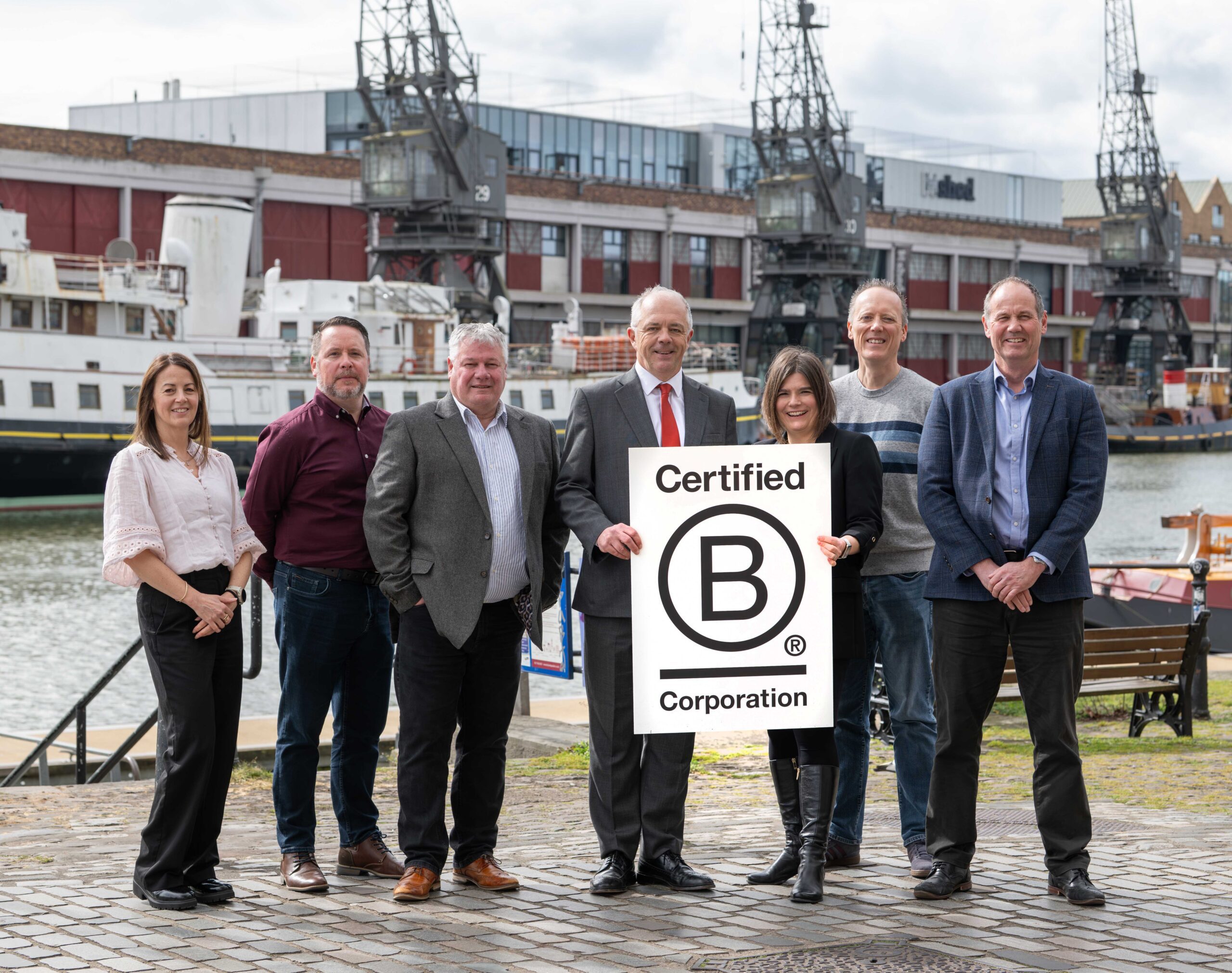 Celebrating our B Corp certification are, from left: project manager Shelley Anderson, regional facilities manager Jim Solomon, head of Bristol office Paul Bray, CEO Paul Crocker, chief people officer Amy Taylor, programme director Alasdair McAlley and chief operations officer Scott Bentley (Photo: Dave Pratt)